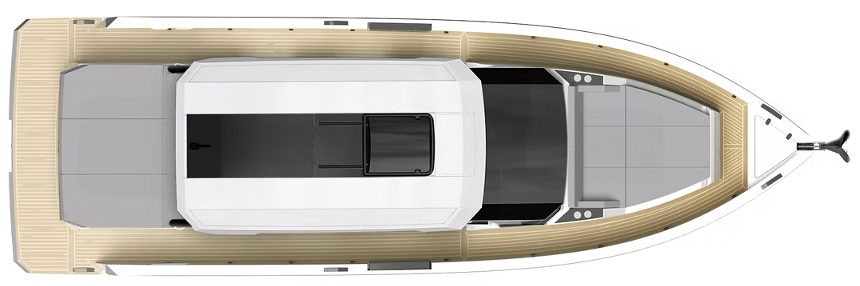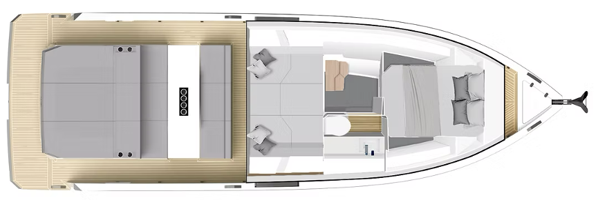 Чистые, минималистичные линии корпуса D32 скрывают пару подвесных моторов под кормовой солнечной площадкой, сохраняя тишину и изящество внешнего облика. Кокпит предлагает трансформируемую зону отдыха с регулируемыми спинками, обеденным столом и встроенным мокрым баром. Широкие проходы по бортам ведут на нос к просторной солнечной площадке. Версия с жёсткой крышей обеспечивает отличную защиту от солнца и подчёркивает современный силуэт.