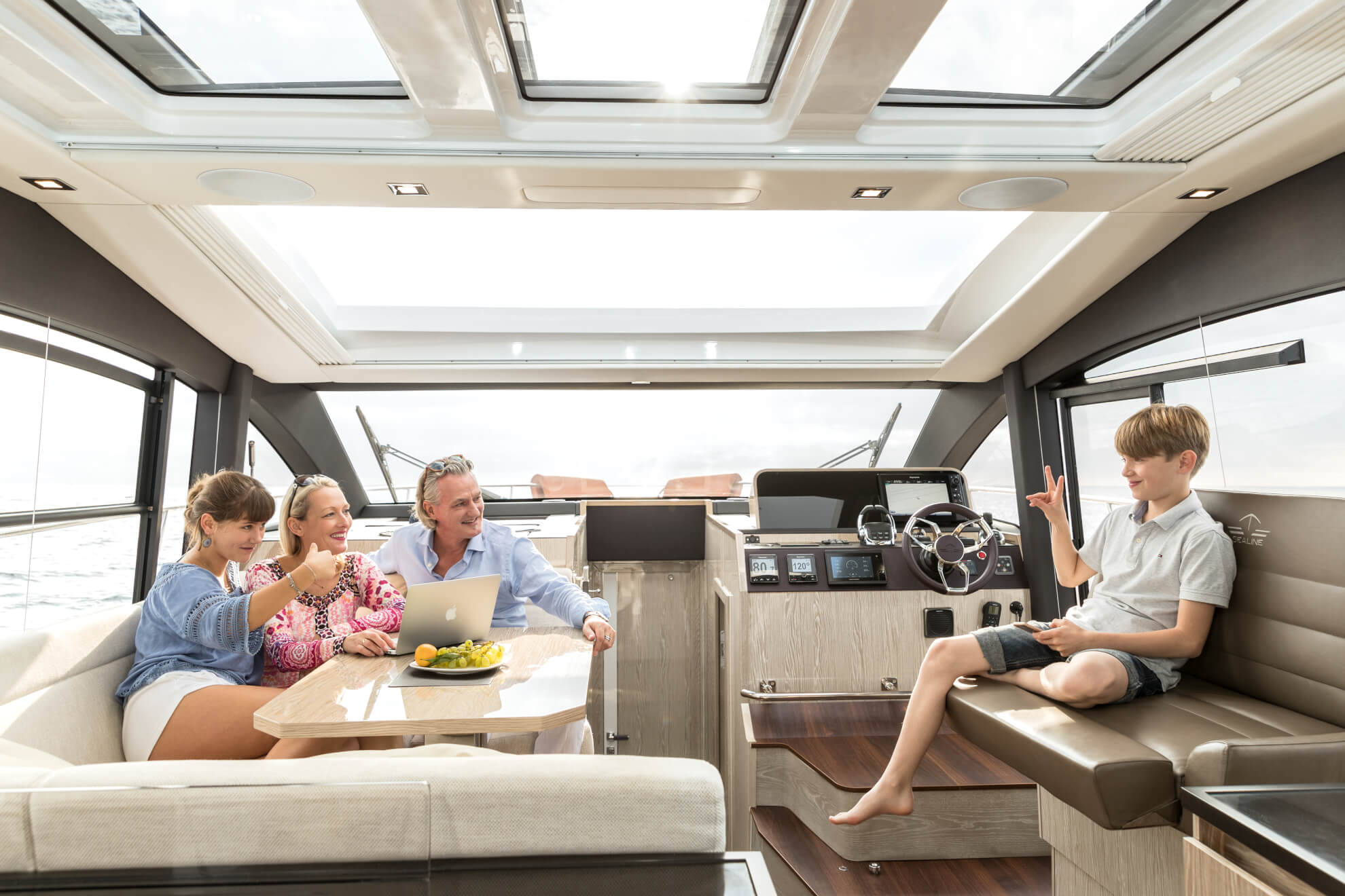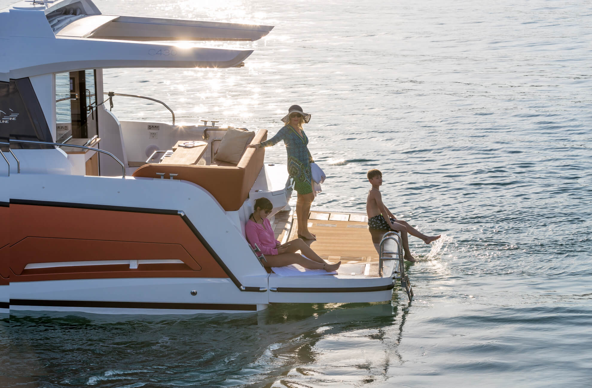 Sealine C430 — просторная яхта-кабриолет. Выразительные окна корпуса придают яхте характерный для серии Sealine вид, а общая остекленная площадь этого судна составляет революционные 26 м2. Открыв раскладную крышу на электрическом приводе, можно сделать интерьер еще более солнечным. Три роскошные зоны отдыха на яхте Sealine C430 создают идеальную атмосферу для любого случая. Открыв дверь салона, можно объединить внешнюю и внутреннюю части и создать настоящий лофт на борту. Стандартная планировка предусматривает каюту хозяина в центре судна, а также VIP-каюту в носовой части. По желанию можно добавить еще две полноценные двойные каюты.