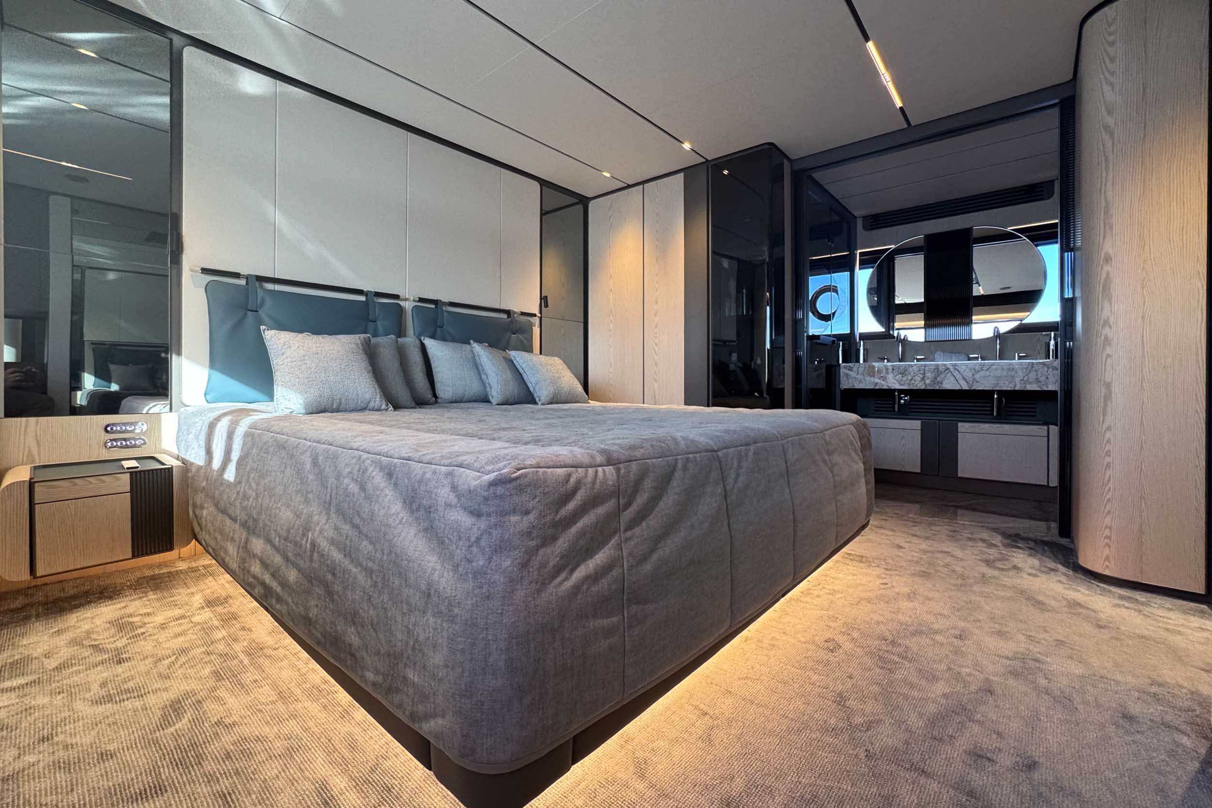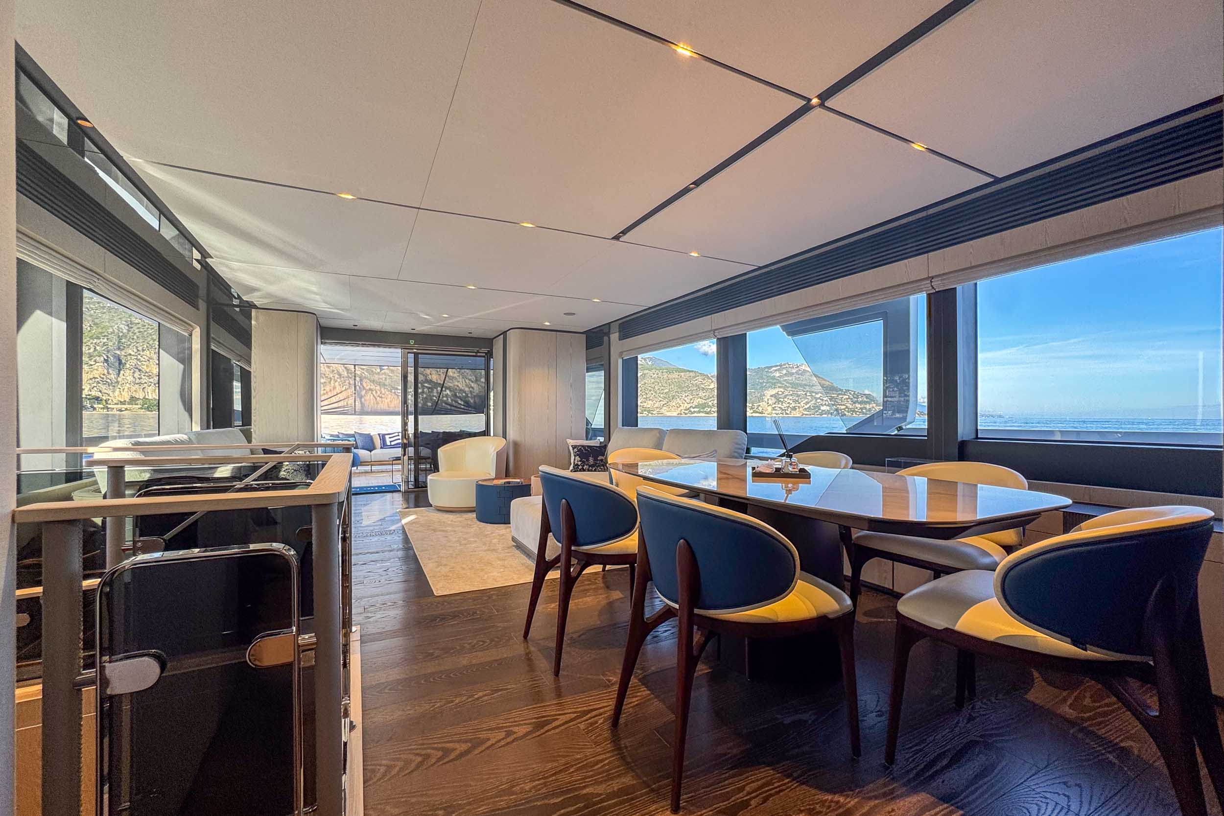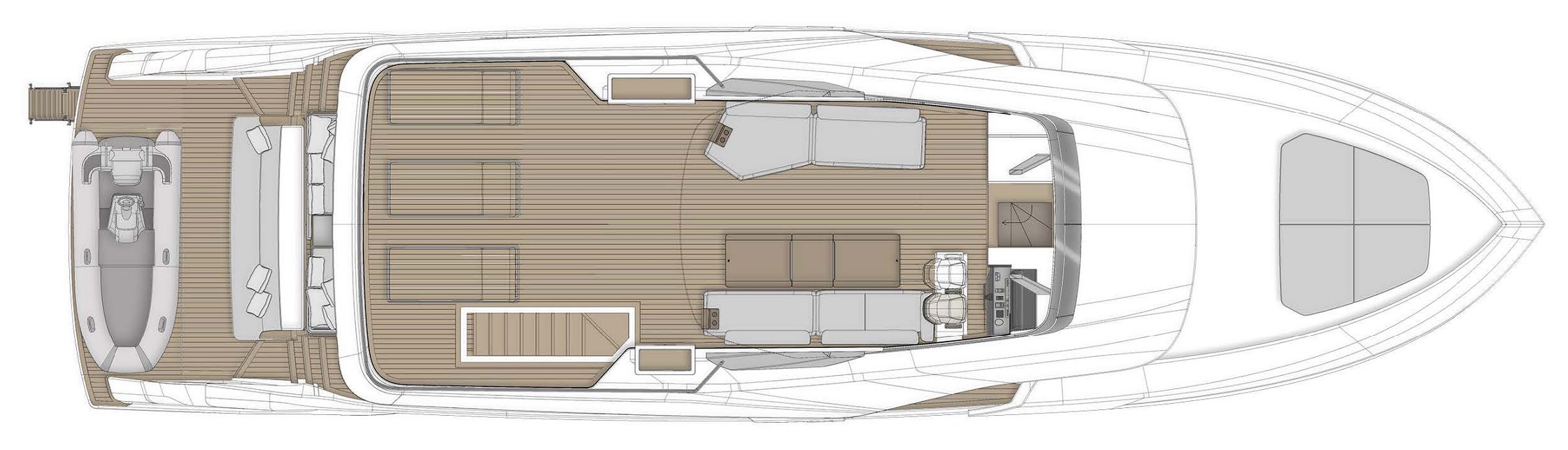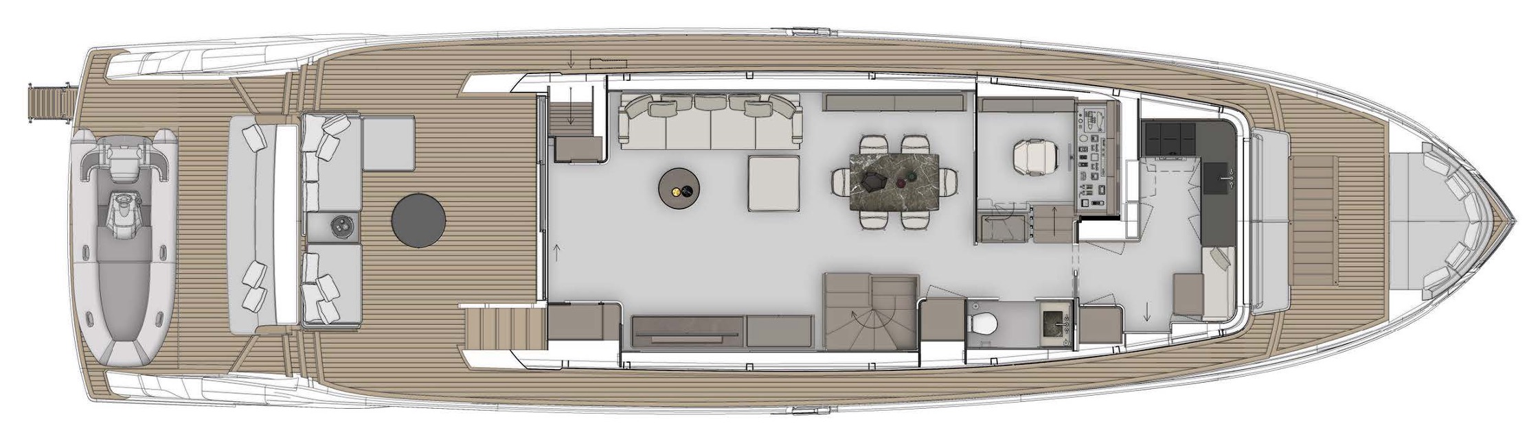 Верхняя палуба Infynito 80 с просторным флайбриджем и гарнитурами, удобная пляжная платформа, зона для купания, тикированные палубы, стильные тенты и усовершенствованные элементы — всё это делает яхту удобной и красивой как для дневного отдыха, так и для вечерних прогулок. Благодаря системам адаптивной швартовки, подруливающему устройству, гиростабилизаторам и гидравлическому трапу/платформе, яхта легко манёвренная, устойчивая и комфортная в эксплуатации, как в море, так и на стоянке.