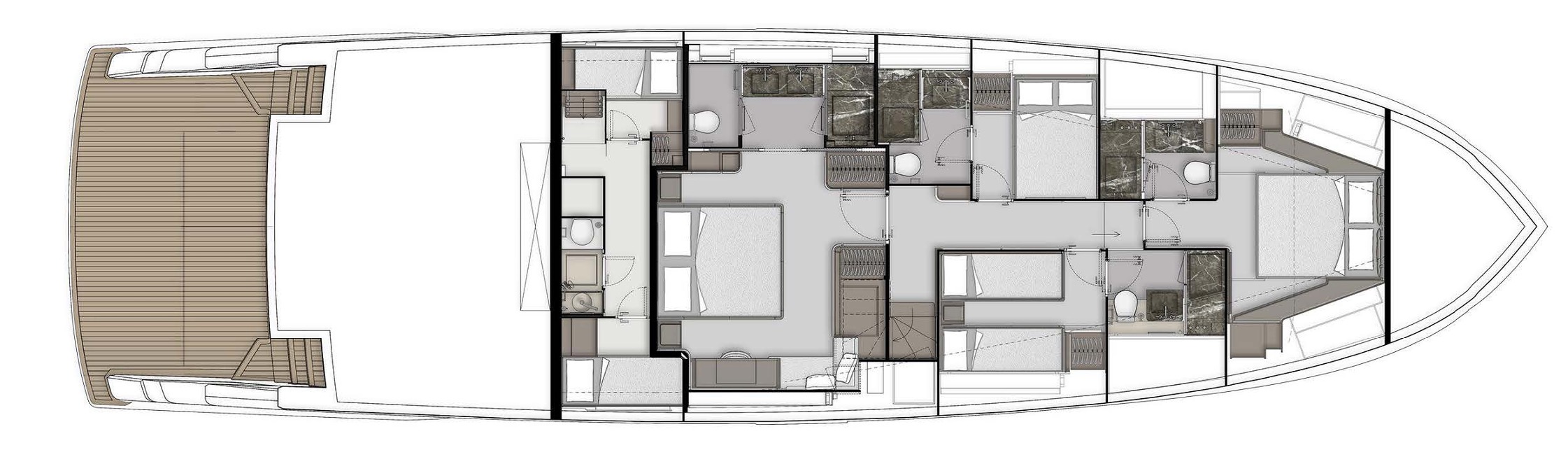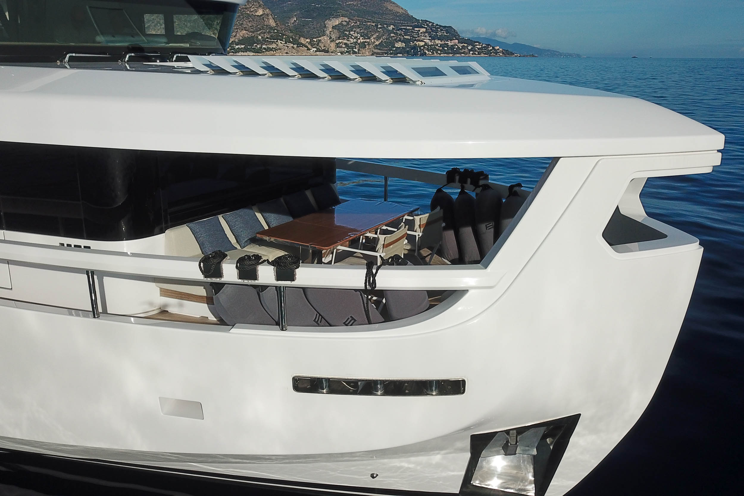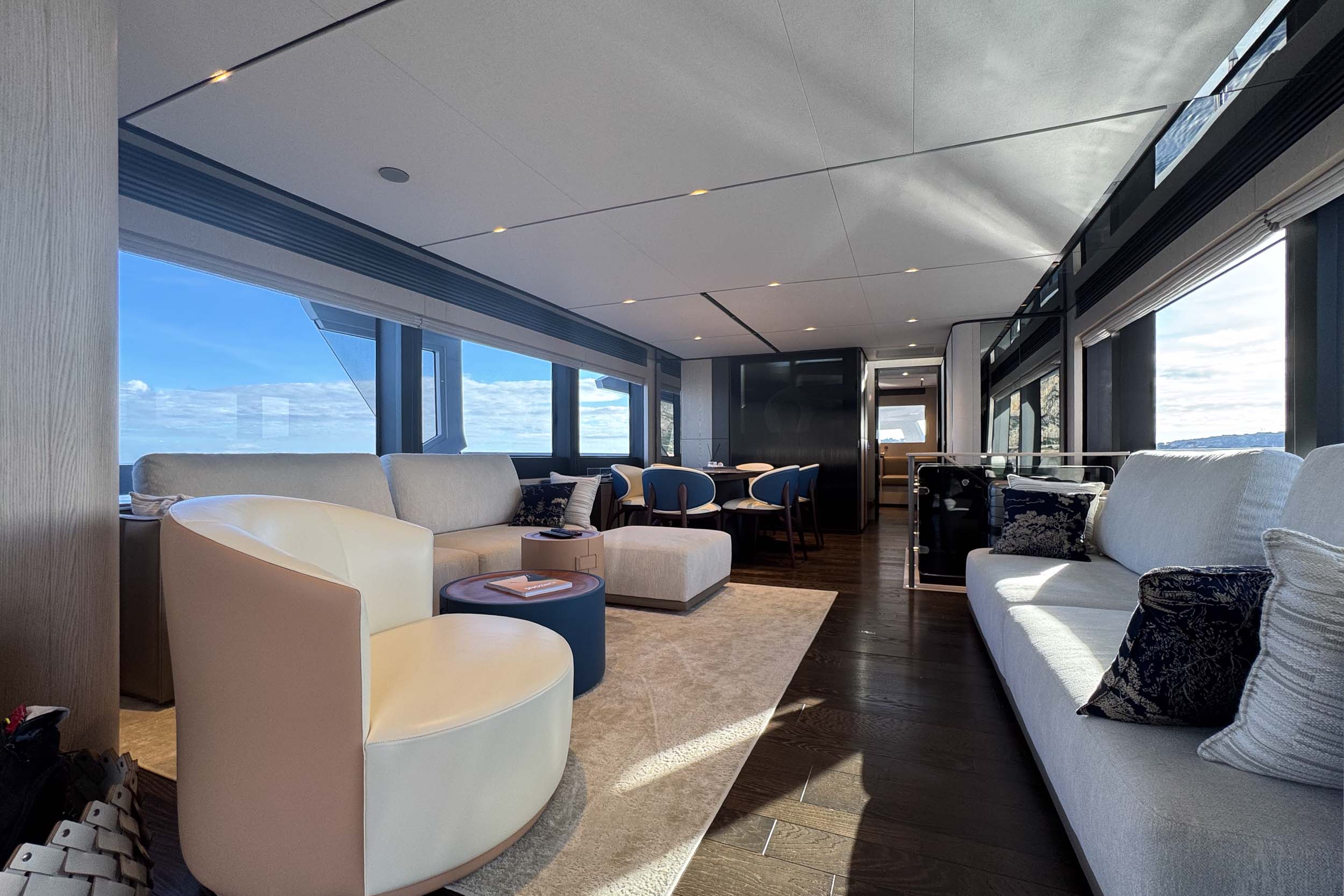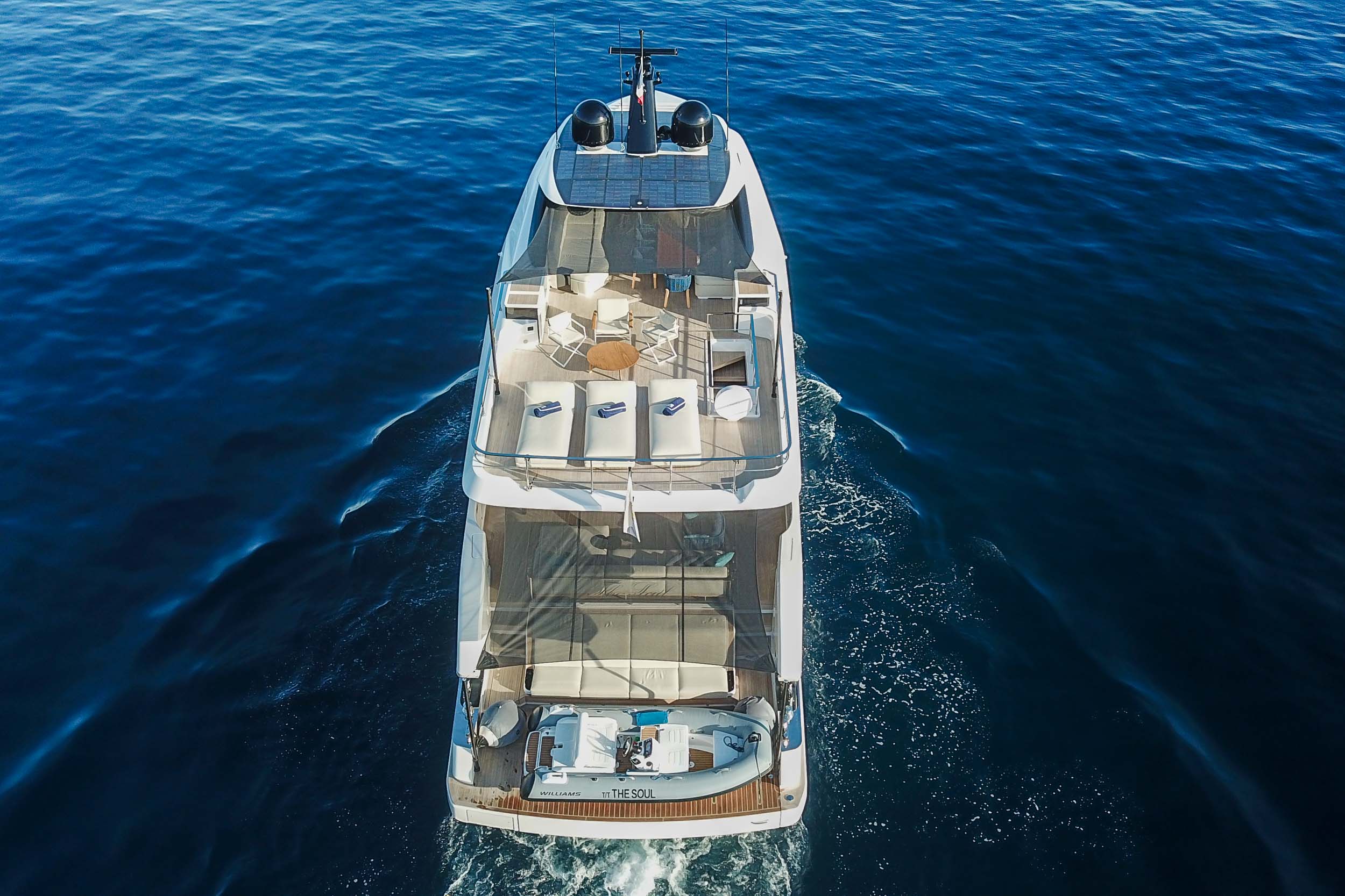 Верхняя палуба Infynito 80 с просторным флайбриджем и гарнитурами, удобная пляжная платформа, зона для купания, тикированные палубы, стильные тенты и усовершенствованные элементы — всё это делает яхту удобной и красивой как для дневного отдыха, так и для вечерних прогулок. Благодаря системам адаптивной швартовки, подруливающему устройству, гиростабилизаторам и гидравлическому трапу/платформе, яхта легко манёвренная, устойчивая и комфортная в эксплуатации, как в море, так и на стоянке.