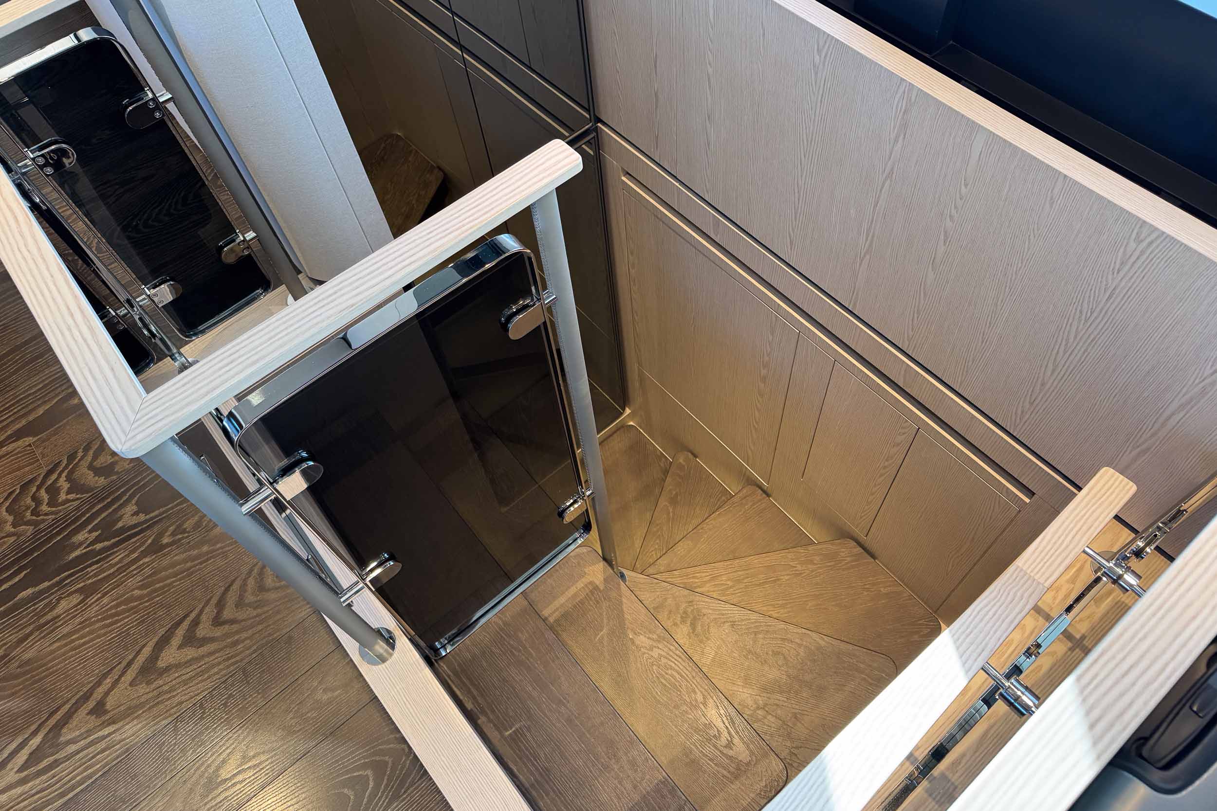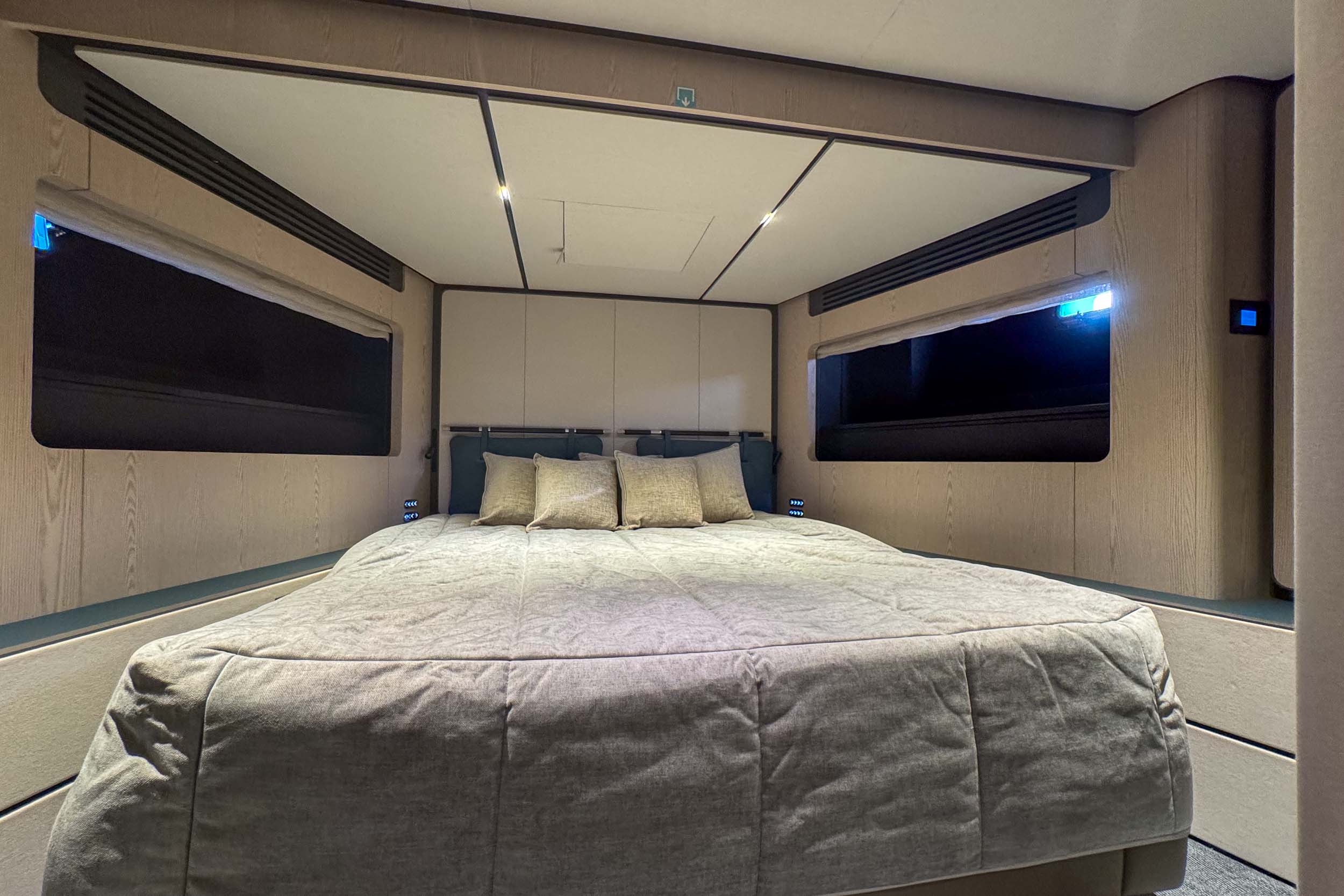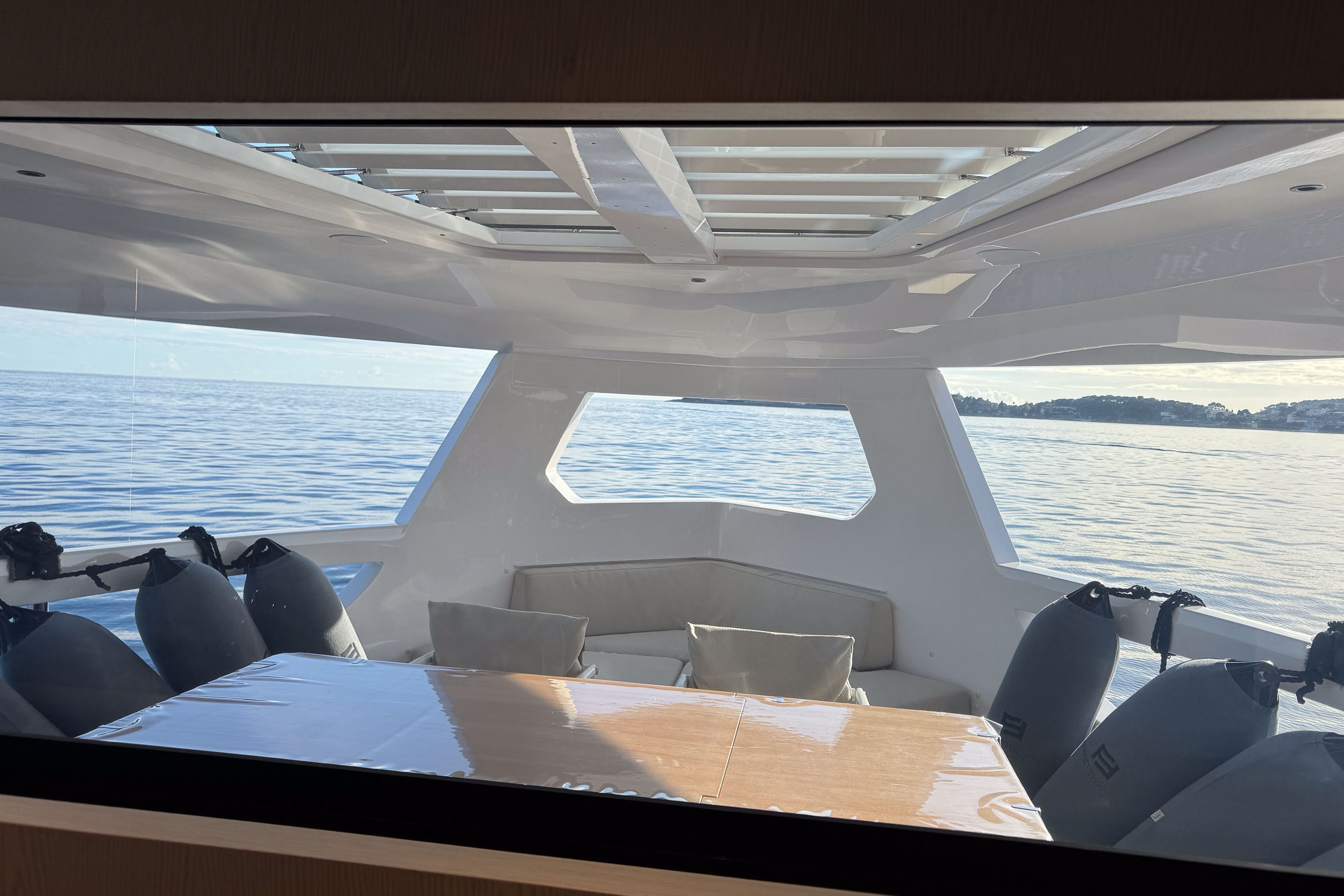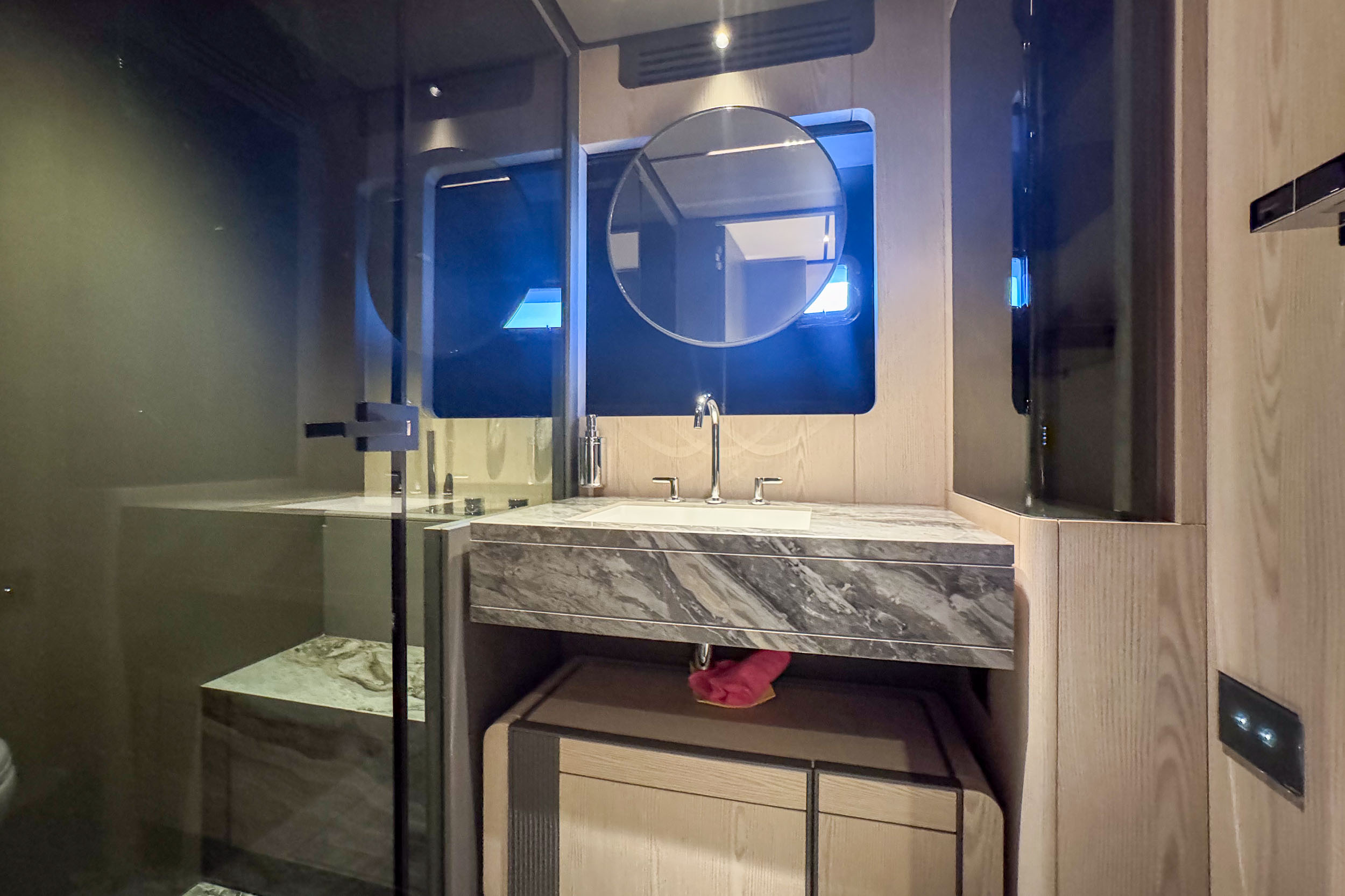 Верхняя палуба Infynito 80 с просторным флайбриджем и гарнитурами, удобная пляжная платформа, зона для купания, тикированные палубы, стильные тенты и усовершенствованные элементы — всё это делает яхту удобной и красивой как для дневного отдыха, так и для вечерних прогулок. Благодаря системам адаптивной швартовки, подруливающему устройству, гиростабилизаторам и гидравлическому трапу/платформе, яхта легко манёвренная, устойчивая и комфортная в эксплуатации, как в море, так и на стоянке.