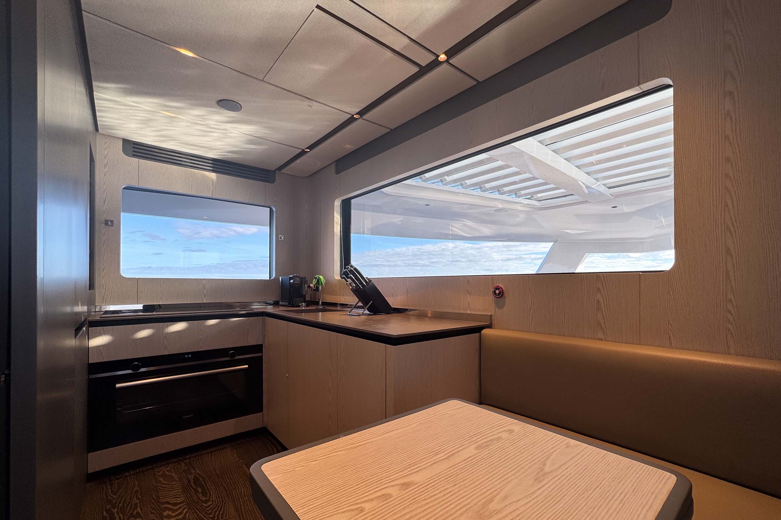 Внутри яхта оформлена по стандарту премиум-класса: просторные каюты, салон, светлые лаунж-зоны, кухня (камбуз) с современной бытовой техникой, отдельные удобства для гостей и экипажа. Главная палуба с её планировкой face-to-face диванами и потолочным ТВ создаёт уютную и гостеприимную атмосферу. Материалы отделки — тик, паркет и декоративные ткани. Установлены современные системы для комфорта: кондиционирование, звукоизоляция, качественное освещение, электро-шторы и blackout, аудио- и видеооборудование, всё для максимально комфортного пребывания на борту как в плавании, так и на стоянке.