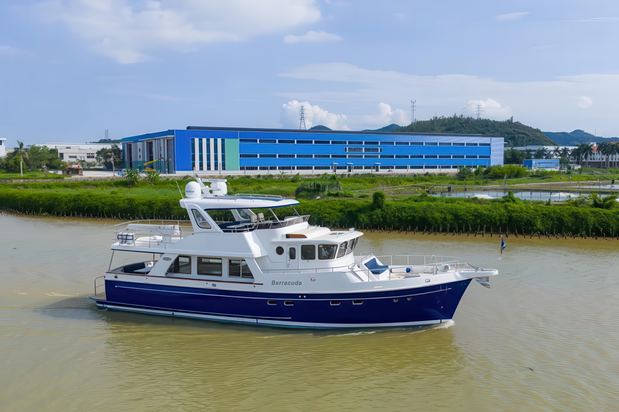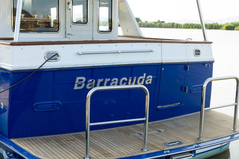 Корпус Selene 56 цвета Royal Blue со светло-голубым необрастающим покрытием днища придает яхте свежий и элегантный вид на воде. Название «Barracuda» выполнено из нержавеющей стали с подсветкой на бортах и корме — днем оно сверкает под солнечными лучами, а ночью превращается в ослепительное сияние.