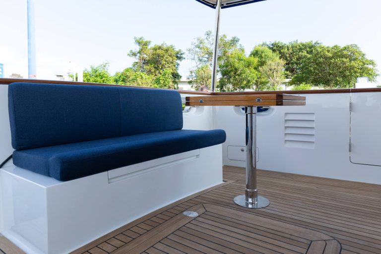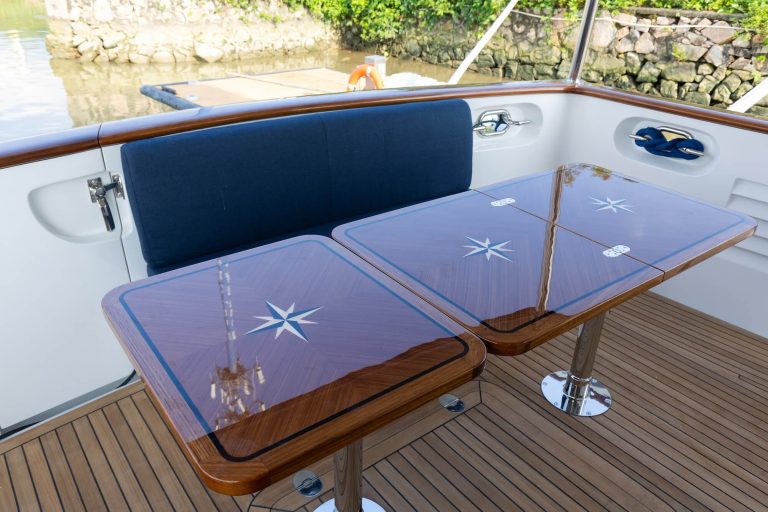 В кокпите трехсекционный раскладной стол, спроектированный Ховардом, позволяет эффективно использовать пространство и обеспечивает легкий доступ в лазарет через люк в палубе. Боковые двери и трехстороннее остекление создают приватное пространство, уменьшая воздействие ветра и волн в пути. Летом в зону кокпита можно направить кондиционированный воздух, что позволяет наслаждаться морем в комфортных условиях.