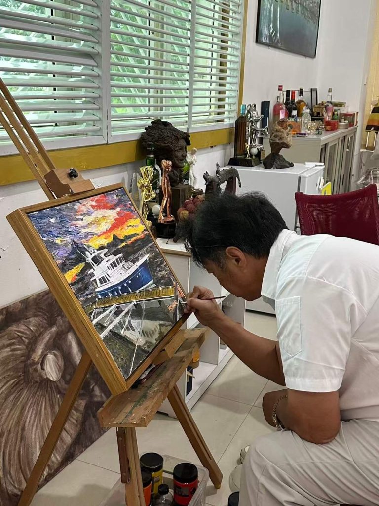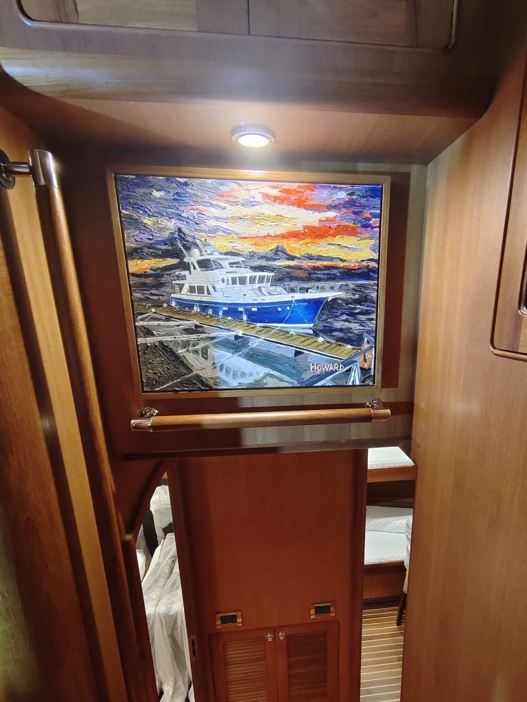 Генеральный директор Jet-Tern Marine, Ховард, преподнес владельцу в подарок написанную собственноручно картину, которую установили над лестницей в жилую зону. Дополнительная подсветка создает мягкое свечение, подчеркивающее уютную и морскую атмосферу всего интерьера.