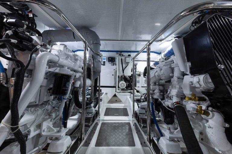 Яхта оснащена двумя двигателями John Deere 4045AFM85 M2 (180 л.с. при 2400 об/мин) с редукторами ZF 220 с PTO-площадкой, носовыми и кормовыми подруливающими устройствами Sidepower SH320, гидравлическим стабилизатором, а также генератором Onan 13,5 кВт 50Hz 24V и дополнительным Onan 6 кВт 50Hz 12V. Полностью защищенный киль обеспечивают надежность и устойчивость на ходу. По обеим сторонам флайбриджа расположены спасательные плоты вместимостью по 8 человек, всего на 16 мест, что гарантирует высокий уровень безопасности для всех пассажиров. Также на флайбридже установлены кильблоки — для тендера и гидроцикла, чтобы владелец мог наслаждаться максимальной свободой на воде.